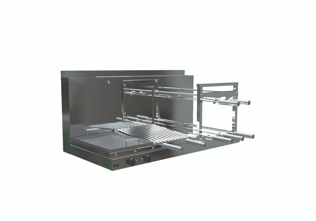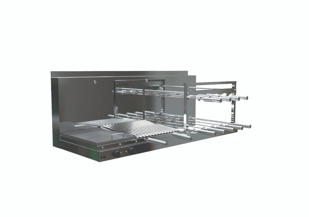 Composta por dois andares de espetos e fixação na parte frontal, ainda conta com o sistema de grelha automatizada. E com o motor na parte traseira aumentando a estética do ambiente: